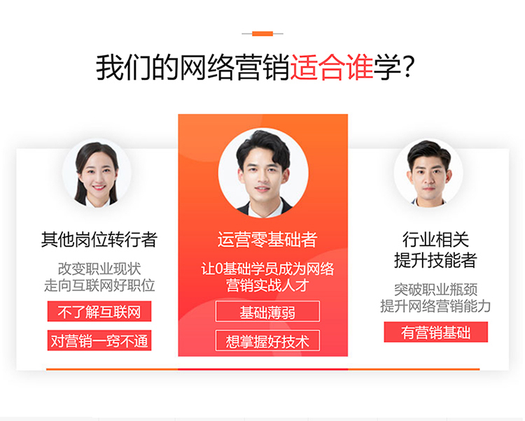适学人群:零基础,适合应往届毕业生、在职提升、转行或待业等有志于进入IT、互联网、运营行业发展的人群
