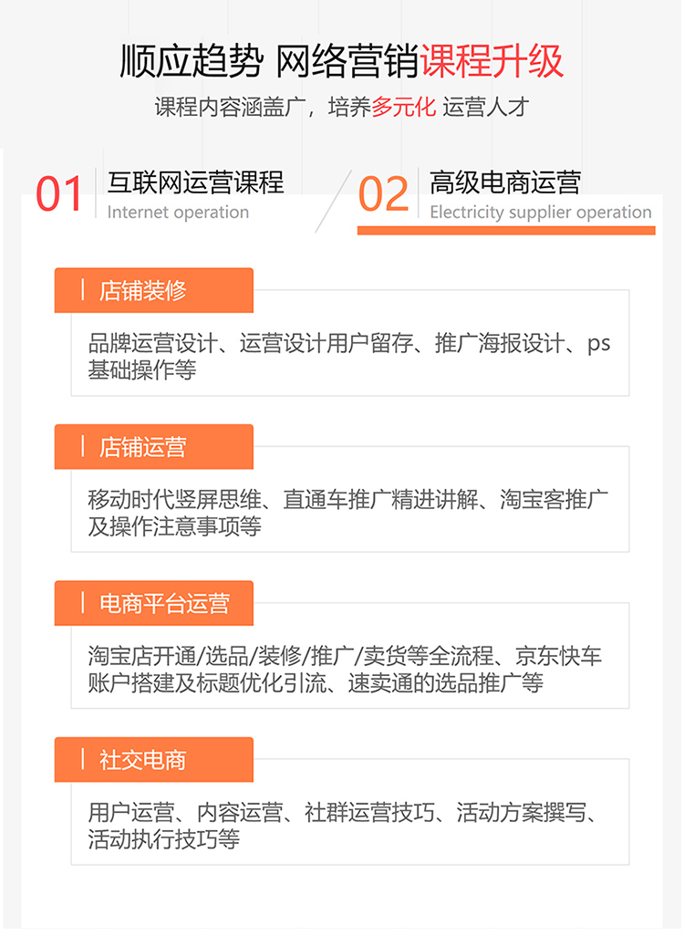 培养目标:培养具备1年以上互联网运营工作经验的工作人员,毕业后能胜任互联网运营、网络推广、网络营销岗位