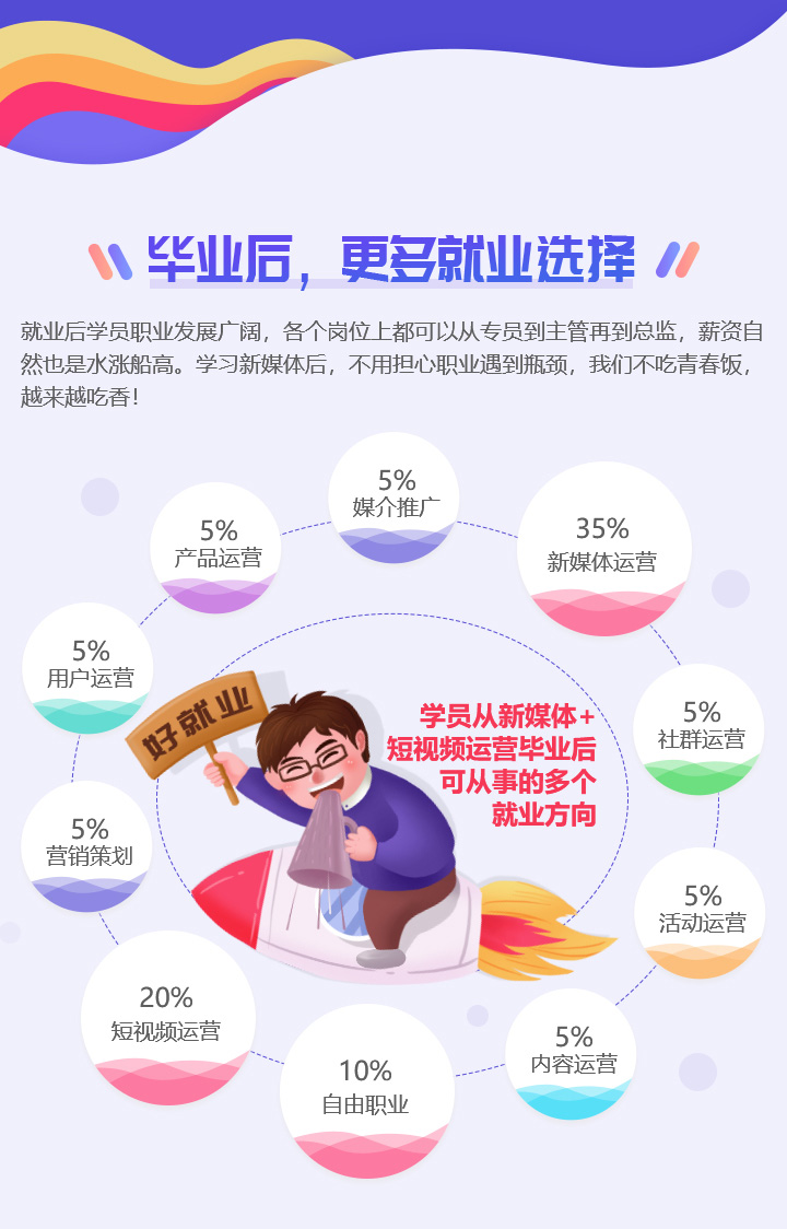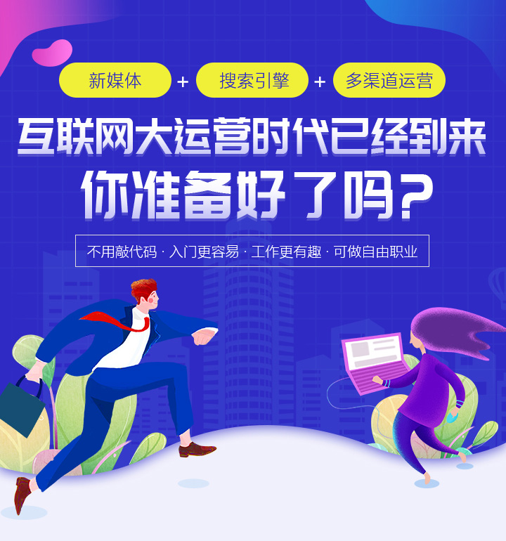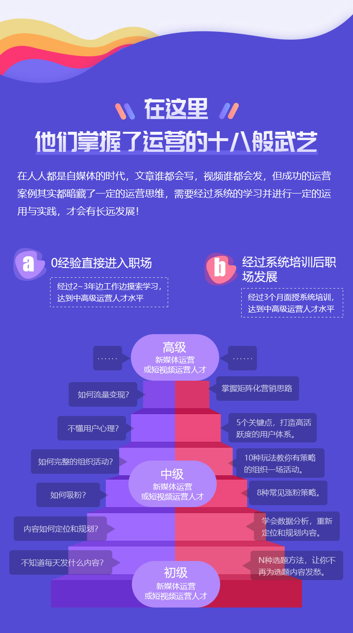 培养目标:培养具备1-2年以上互联网运营、网络营销工作经验,毕业后能胜任营销经理、运营总监岗位