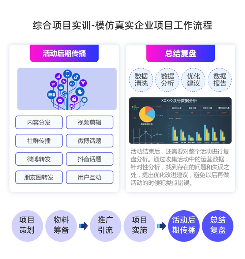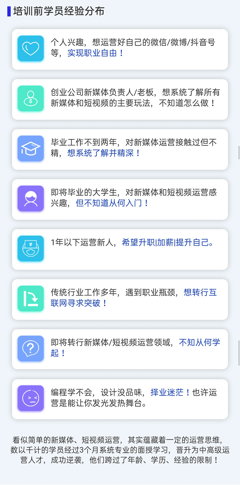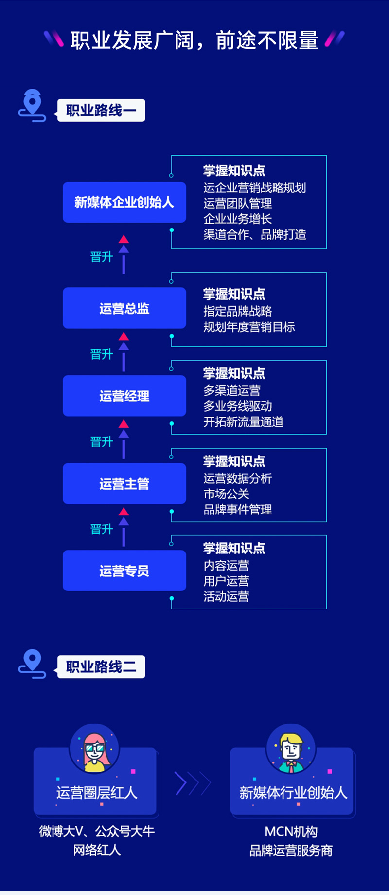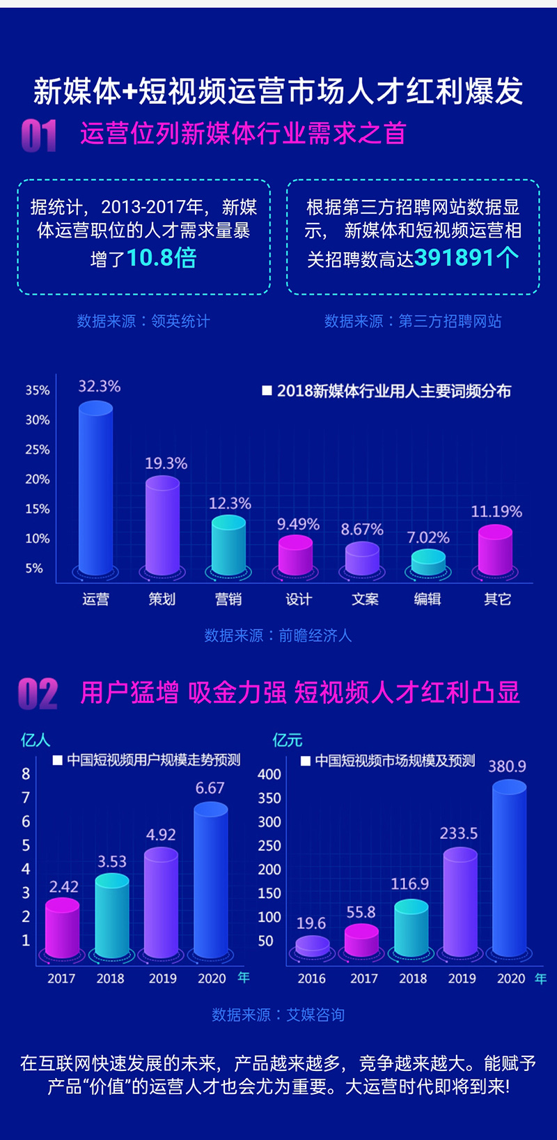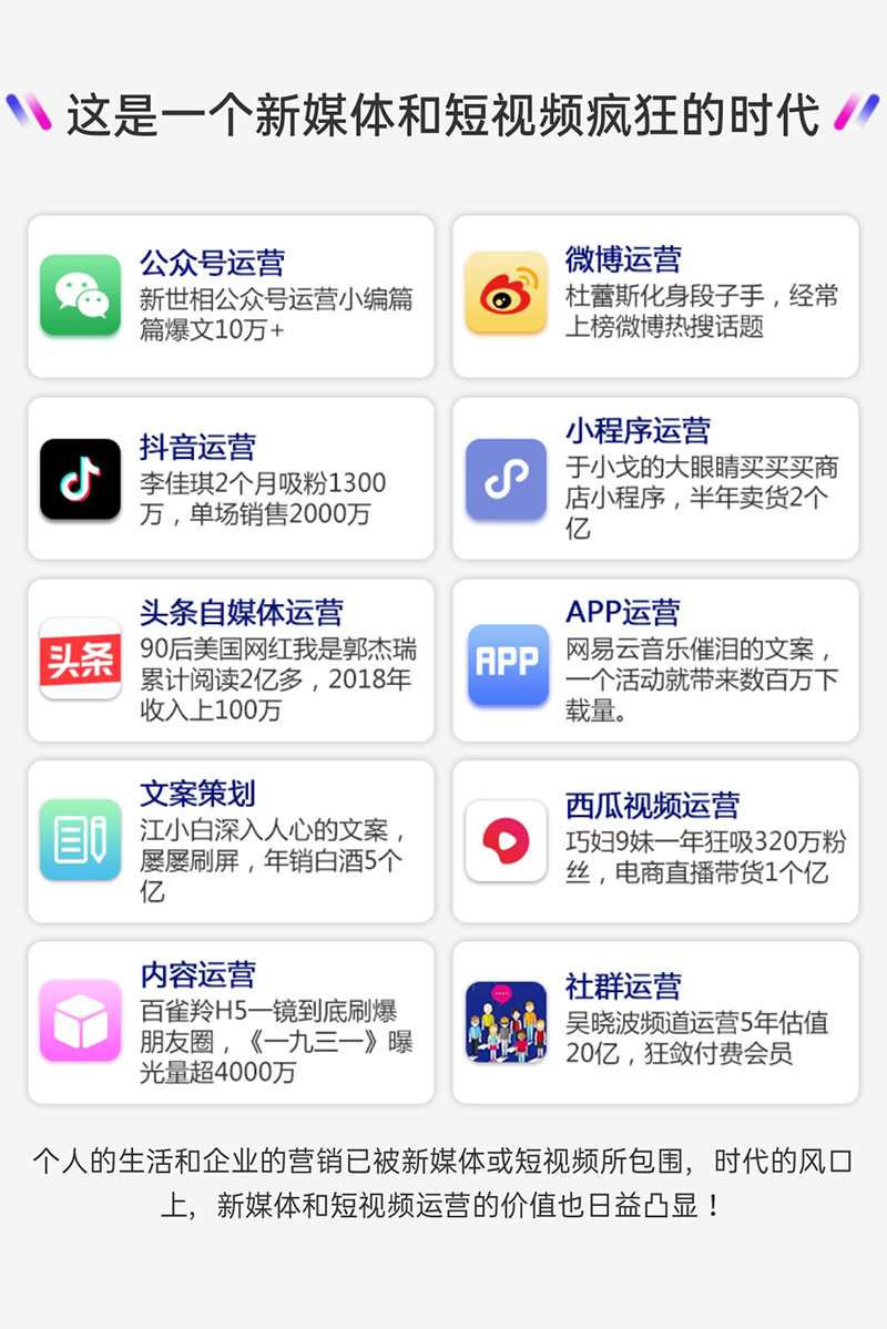 培养目标:培养具备1年以上新媒体运营经验的工作人员,毕业后能胜任新媒体运营、短视频运营等岗位
