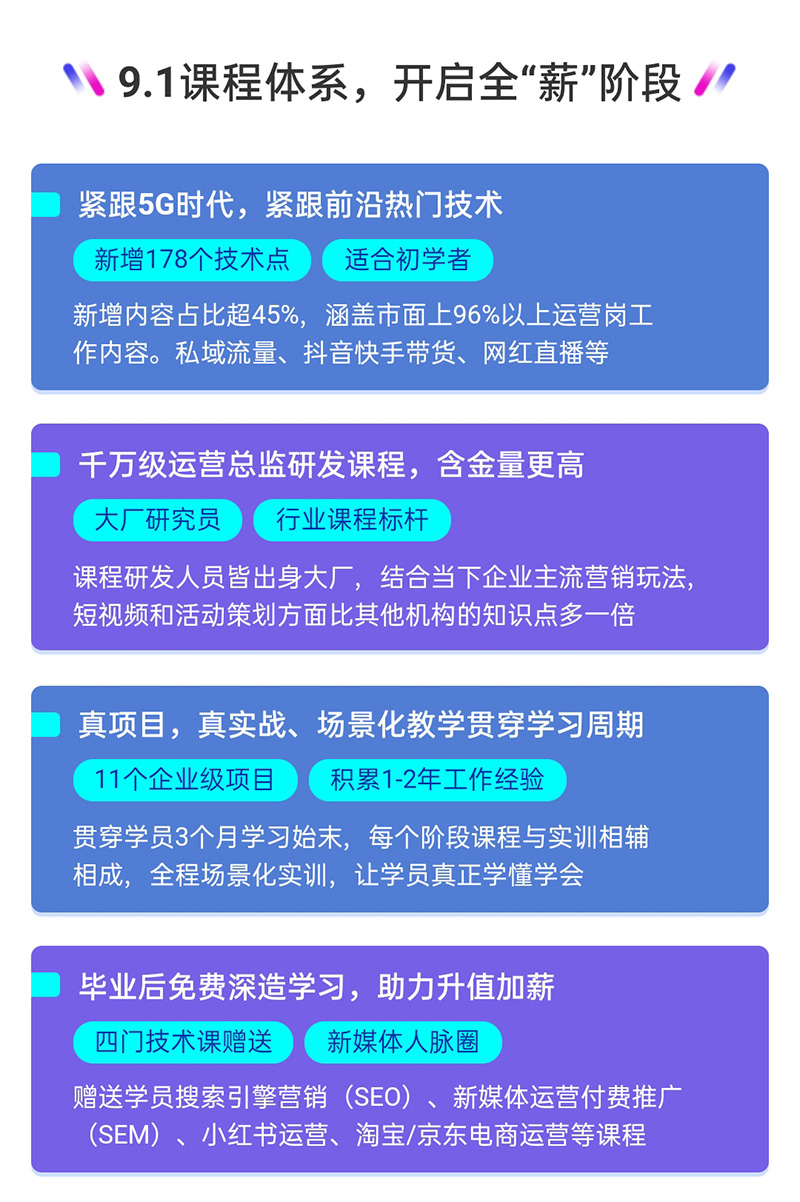 适学人群:零基础,适合应往届毕业生、在职提升、转行或待业等有志于进入IT、互联网、市场运营行业发展的人群